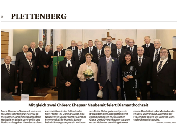 Als nächstes steht das Singen am 1. Dezember beim Johannimarkt der Werbegemeinschaft Eiringhausen mit einem einstündigen weihnachtlichen Programm in der Johanneskirche auf der To-Do-Liste. Mit dabei sein wird der MGV Plettenberg unter der Leitung von Chordirektor FDC Hubertus Schönauer und eine Organistin. Weihnachtsgeschichten runden das Programm ab.